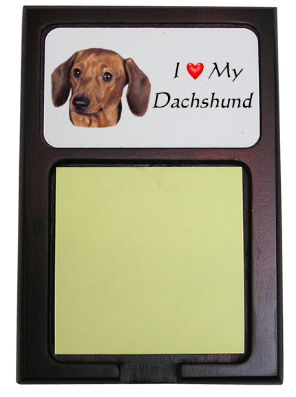 Dachshund Wooden Sticky Note Holder features a beautiful Dachshund image printed on an aluminum insert. Overall measures about 4 inches wide by 6 inches long. Complete with a 3 x 3 inch Post-it® Note Pad. It makes a great item for the home or office of dog lovers.