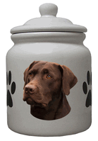 The Color Ceramic Chocolate Labrador Retriever Cookie Jar is both beautiful and useful. It is a must for every Chocolate Labrador Retriever lover and is a fantastic gift item. The cookie jar provides a great place to store dog treats or people cookies. It measures about 6 inches wide and 9 inches high with an airtight seal inside the lid. The ceramic color treat jar is dishwasher safe and features a color Chocolate Labrador Retriever image with paw prints on the sides.
