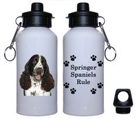 The 600ml White Aluminum Springer Spaniel Water Bottles are the perfect size to bring to sporting events, for taking beverages to school or to give as a Springer Spaniel themed gift. It features a colorful Springer Spaniel on one side with Springer Spaniels Rule and paws on the flipside. The water bottle comes with 2 cap fixings. One cap is a flip top stopper allowing you to drink from the bottle without removing the cap and the other screw top cap allows the bottle to be clipped to a belt and is supplied with a metal clasp. These White Aluminum Water Bottles are sturdy, lightweight and easy to clean.