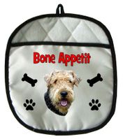 These soft, 100% terrycloth lined potholders have a heat-resistant black cotton palm, white poly top and a black cotton trim. Wonderfully decorated with your favorite Airedale these oven mitts are a must for every household. Overall the potholders measure about 9 by 10.5. Wash in cold water.