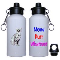 The 600ml White Aluminum American Shorthaired Cat Water Bottles are the perfect size to bring to sporting events, for taking beverages to school or to give as a gift. It features a colorful American Shorthaired Cat on one side with the saying Meow Purr Whatever on the flipside. The water bottle comes with 2 cap fixings. One cap is a flip top stopper allowing you to drink from the bottle without removing the cap and the other screw top cap allows the bottle to be clipped to a belt and is supplied with a metal clasp. The overall size with cap is about 7.5 inches high and 2.9 inches in diameter. These White Aluminum Water Bottles are sturdy, lightweight and easy to clean. Makes a great gift for cat lovers.