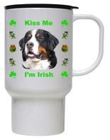 Celebrate all year long with our popular line of Irish themed Bernese Mountain Dog decorated products. This 15 oz Travel Mug is made of a special bright white plastic polymer that makes it dishwasher and microwave safe. It features a festive picture of a great looking Bernese Mountain Dog on both sides surrounded with Shamrocks, Leprechauns and the phrase Kiss Me I’m Irish. The Bernese Mountain Dog Irish Travel Mug is lightweight, unbreakable and comes with a lid.