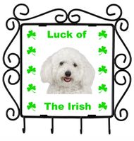 Celebrate all year long with our popular line of Irish themed Bichon decorated products. The Bichon Irish Metal Key Holder features a fabulous Bichon image and the saying – Luck of the Irish. The Irish Bichon Metal Key holder consists of a 6-inch Ceramic tile surrounded by an elegant black metal frame and four prongs to hang your keys. This item is great to hang in any room of the house or to give to as a special Bichon lover's gift. The metal frame measures about 8.75 wide by 9 inches high.