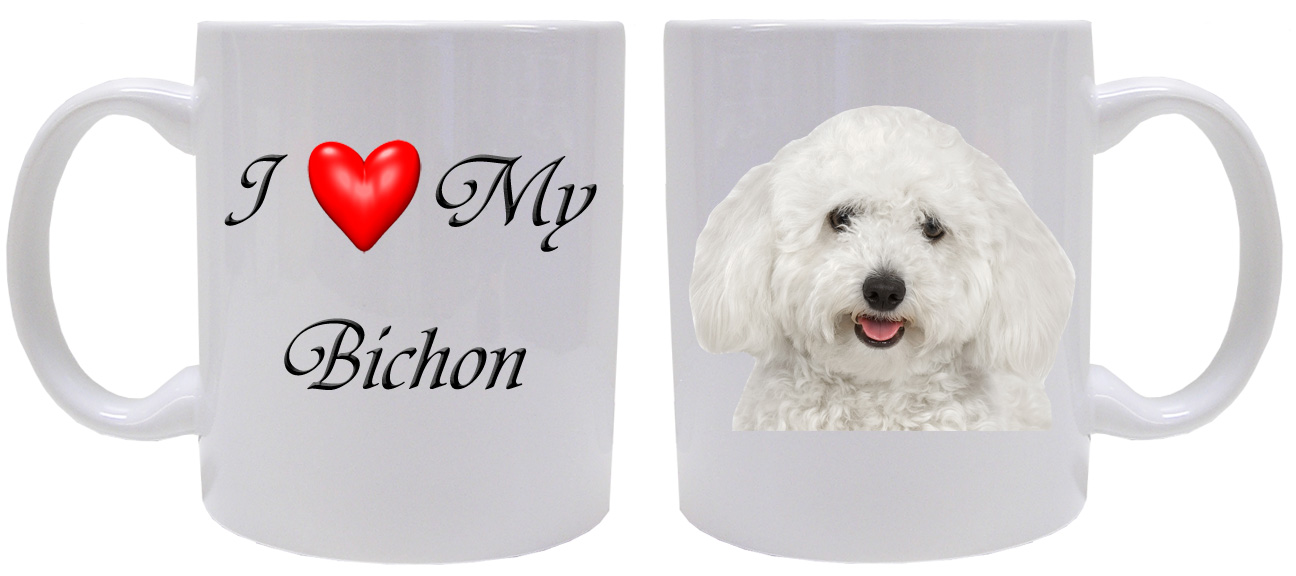 An 11 oz. ceramic Bichon coffee mug with a picture of a great looking Bichon on one side and I Love My Bichon on the other. This beautifully designed coffee mug is dishwasher and microwave safe. Great as a gift item for the dog lover or to add to your own collection.