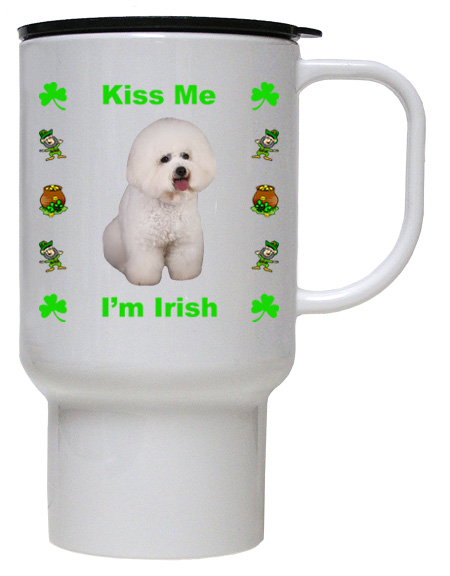 Celebrate all year long with our popular line of Irish themed Bichon decorated products. This 15 oz Travel Mug is made of a special bright white plastic polymer that makes it dishwasher and microwave safe. It features a festive picture of a great looking Bichon on both sides surrounded with Shamrocks, Leprechauns and the phrase Kiss Me I’m Irish. The Bichon Irish Travel Mug is lightweight, unbreakable and comes with a lid.