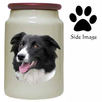 The Canister jar is a smaller version of our very popular Border Collie decorated Cookie Jar. These Canister jars are the perfect holder for small dog or cat treats. Great as a gift, this Border Collie decorated Canister jar is just the right size to fill with people stuff such as coffee, tea or sugar and will compliment any kitchen. Measuring about 6 inches tall with a 12-inch circumference and 3.5 inches in diameter, the white ceramic canister jars are sealed tightly with a mahogany finished wood lid for the perfect touch.