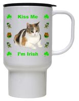 Celebrate all year long with our popular line of Irish themed Calico Cat decorated products. This 15 oz Travel Mug is made of a special bright white plastic polymer that makes it dishwasher and microwave safe. It features a festive picture of a great looking Calico Cat on both sides surrounded with Shamrocks, Leprechauns and the phrase Kiss Me I’m Irish. The Calico Cat Irish Travel Mug is lightweight, unbreakable and comes with a lid.