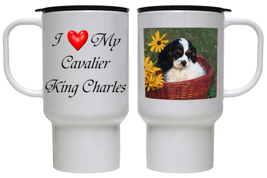 This 15 oz Travel Mug is made of a special bright white plastic polymer that makes it dishwasher and microwave safe. It features a beautiful Cavalier King Charles picture on one face with an I Love you saying on the flip side. The I Love my Cavalier King Charles Travel Mug is lightweight, unbreakable and comes with a lid.