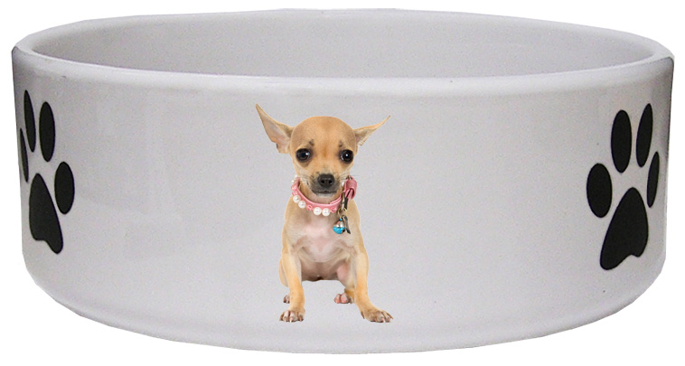 An attractive ceramic Chihuahua Dog Bowl, decorated with images of a Chihuahua and paw prints. This sturdy, deep, white bowl is hard to tip over, yet easy to clean and are dishwasher safe. This beautifully designed Dog Bowl is a must for the serious Chihuahua fancier or as a gift for a Chihuahua lover. The dog bowl measures about 7 inches in diameter and 2.75 inches deep.