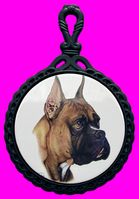 A cast iron Boxer trivet surrounding a ceramic tile. Art by internationally acclaimed artist Vladimir Tzenov. Each tile presents a fabulous "Best of Breed" color Boxer image. This beautifully designed round trivet looks great simply hanging on a wall or use it on the kitchen table. Great as a gift item for the Boxer fancier. The ceramic tile is about 7 inches in diameter.