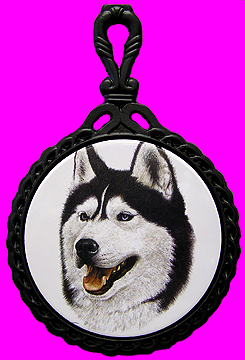 A cast iron Siberian Husky trivet surrounding a ceramic tile. Art by internationally acclaimed artist Vladimir Tzenov. Each tile presents a fabulous "Best of Breed" color Siberian Husky image. This beautifully designed round trivet looks great simply hanging on a wall or use it on the kitchen table. Great as a gift item for the Siberian Husky fancier. The ceramic tile is about 7 inches in diameter.