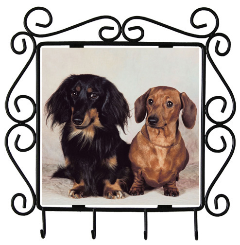 The Dachshund Metal Key holder features a 6 inch Ceramic tile surrounded by an elegant black metal frame and four prongs to hang your keys.  This item is great to hang in any room of the house or to give to as a special Dachshund gift. The metal frame measures about 8.75 wide by 9 inches high.