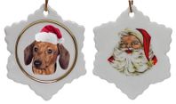 The Jolly Santa Snowflake Christmas Ornament features Santa on one side and a wondrous Dachshund on the other face. This porcelain Snowflake ornament measures about 3 inches across and looks great on the Christmas tree. Give it as a holiday gift or collect as part of your holiday tradition.