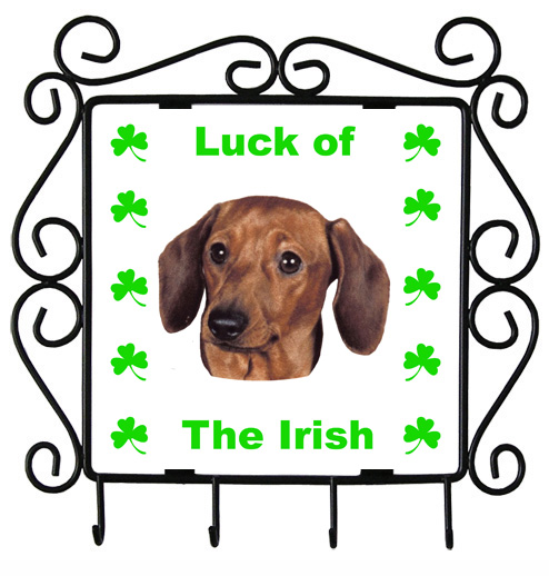 Celebrate all year long with our popular line of Irish themed Dachshund decorated products. The Dachshund Irish Metal Key Holder features a fabulous Dachshund image and the saying – Luck of the Irish. The Irish Dachshund Metal Key holder consists of a 6-inch Ceramic tile surrounded by an elegant black metal frame and four prongs to hang your keys. This item is great to hang in any room of the house or to give to as a special Dachshund lover's gift. The metal frame measures about 8.75 wide by 9 inches high.