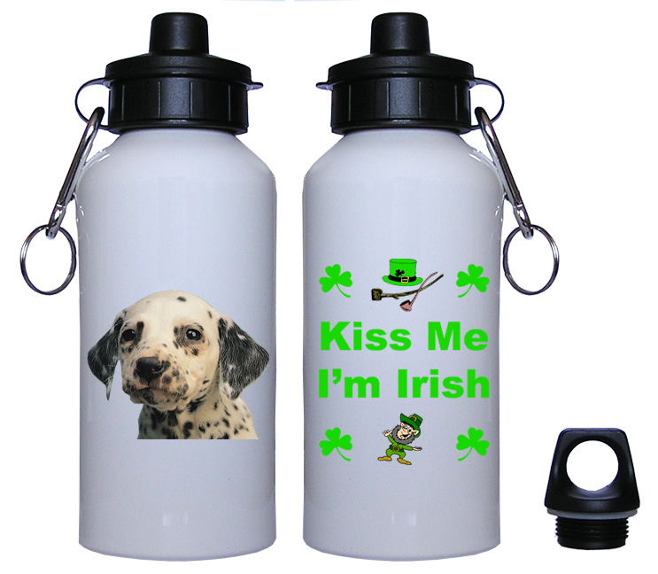 Celebrate all year long with our popular line of Irish themed Dalmatian decorated products. Our 600ml White Aluminum Dalmatian Irish Water Bottles are the perfect size to bring to sporting events, a parade, for taking beverages to school or to give as a Dalmatian themed gift. It features a colorful Dalmatian on one side with the phrase Kiss Me I’m Irish on the flipside. The water bottle comes with 2 cap fixings. One cap is a flip top stopper allowing you to drink from the bottle without removing the cap and the other screw top cap allows the bottle to be clipped to a belt and is supplied with a metal clasp. These White Aluminum Water Bottles are sturdy, lightweight and easy to clean.