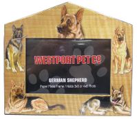 Showing off photos of "Man's Best Friend" has never been easier with these German Shepherd doghouse shaped picture frames. Each photo frame features beautifully rendered drawings of German Shepherds. Overall picture frame size is 6-1/4 x 7 inches and holds pictures 3 x 5 or 4 x 6. Great for your own German Shepherd collection or as a German Shepherd lover’s gift.