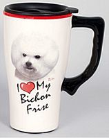 Keep liquids hot or cold with the Ceramic Dog Breed Travel Mug. A beautiful Bichon Frise image decorates this fantastic I Love My Bichon Frise Mug. The Travel Mug features a non-slip bottom, a snap-in lid and is dishwasher safe. A Great item for your own use or as a Bichon Lovers Gift. Measures about 6 1/2 inches high and 3 1/2 inches in diameter.