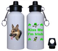 Celebrate all year long with our popular line of Irish themed German Shepherd decorated products. Our 600ml White Aluminum German Shepherd Irish Water Bottles are the perfect size to bring to sporting events, a parade, for taking beverages to school or to give as a German Shepherd themed gift. It features a colorful German Shepherd on one side with the phrase Kiss Me I’m Irish on the flipside.  The water bottle comes with 2 cap fixings. One cap is a flip top stopper allowing you to drink from the bottle without removing the cap and the other screw top cap allows the bottle to be clipped to a belt and is supplied with a metal clasp.  These White Aluminum Water Bottles are sturdy, lightweight and easy to clean.