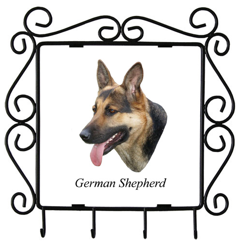 The German Shepherd Metal Key holder features a 6 inch Ceramic tile surrounded by an elegant black metal frame and four prongs to hang your keys. This item is great to hang in any room of the house or to give to as a special German Shepherd gift. The metal frame measures about 8.75 wide by 9 inches high.