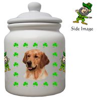 Tasty Pet Treats offers a variety of Golden Retriever themed Irish gifts. The Color Ceramic Irish Golden Retriever Cookie Jar is both beautiful and useful. It is a must for every Golden Retriever lover and is a fantastic gift item. It measures about 6 inches wide and 9 inches high with an airtight seal inside the lid. The ceramic color treat jar is dishwasher safe and features a color Golden Retriever image with Leprechauns on the sides. Celebrate all year long with our popular line of Irish themed Golden Retriever decorated products.