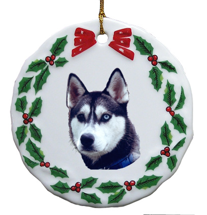 Celebrate Christmas with the beautiful Siberian Husky wreath decorated porcelain ornament. Colorful green holly and a red bow surround a fantastic Siberian Husky image on both sides of this collectible Christmas Ornament. The Holly Wreath Ornament makes a great holiday gift or simply hang on your tree. This flat porcelain ornament measures about 3.5 inches wide.
