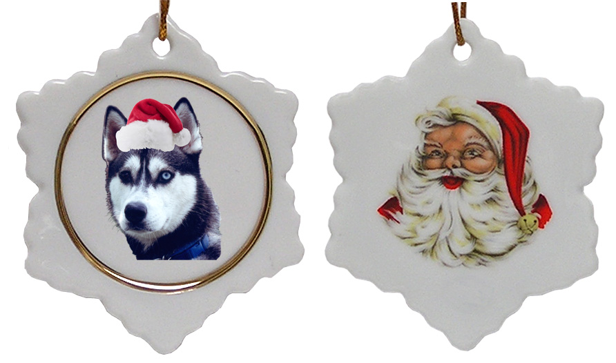 The Jolly Santa Snowflake Christmas Ornament features Santa on one side and a wondrous Siberian Husky on the other face. This porcelain Snowflake ornament measures about 3 inches across and looks great on the Christmas tree. Give it as a holiday gift or collect as part of your holiday tradition.
