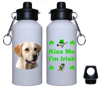 Celebrate all year long with our popular line of Irish themed Labrador Retriever decorated products. Our 600ml White Aluminum Labrador Retriever Irish Water Bottles are the perfect size to bring to sporting events, a parade, for taking beverages to school or to give as a Labrador Retriever themed gift. It features a colorful Labrador Retriever on one side with the phrase Kiss Me I’m Irish on the flipside. The water bottle comes with 2 cap fixings. One cap is a flip top stopper allowing you to drink from the bottle without removing the cap and the other screw top cap allows the bottle to be clipped to a belt and is supplied with a metal clasp. These White Aluminum Water Bottles are sturdy, lightweight and easy to clean.
