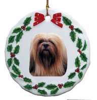 Celebrate Christmas with the beautiful Lhasa Apso wreath decorated porcelain ornament. Colorful green holly and a red bow surround a fantastic Lhasa Apso image on both sides of this collectible Christmas Ornament. The Holly Wreath Ornament makes a great holiday gift or simply hang on your tree. This flat porcelain ornament measures about 3.5 inches wide.