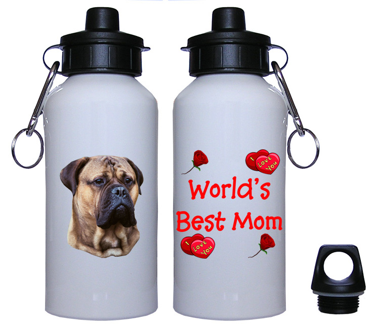 The 600ml White Aluminum Mastiff Worlds Best Mom Water Bottles are the perfect size to bring to sporting events, to take on long walks, or to give as a Mastiff gift. It features a colorful Mastiff on one side with the saying Worlds Best Mom one the other side. The water bottle comes with 2 cap fixings. One cap is a flip top stopper allowing you to drink from the bottle without removing the cap and the other screw top cap allows the bottle to be clipped to a belt and is supplied with a metal clasp.