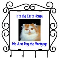 The Persian Cat Metal Key Holder features a 6 inch ceramic tile with a picture of a Persian Cat with the saying It’s The Cats House We Just Pay The Mortgage. The tile is surrounded by an elegant black metal frame with four prongs to hang your keys.  This item is great to hang in any room of the house or to give to as a gift to a cat lover.