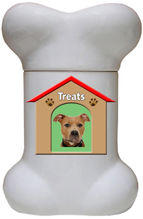 Store your dog’s favorite treats and biscuits in this unique, novelty bone-shaped ceramic cookie jar. This fun bone shaped treat jar makes a great gift for Pitbull lovers and complements any kitchen. The bone jar stands on its end, has an easy lift lid for treat time, is colorfully decorated, and will be the envy of all the dogs in town. It measures 9 inches tall, 6.5 inches wide and 5 inches deep.