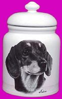 A 6.5 inches wide and 10 inches tall porcelain Dachshund Cookie/Treat Jar. Art by internationally acclaimed artist Vladimir Tzenov. Each rendering presents a Best of Breed Dachshund image. This beautifully designed Cookie Jar is a must for the serious Dachshund fancier or as a Dachshund lover gift.