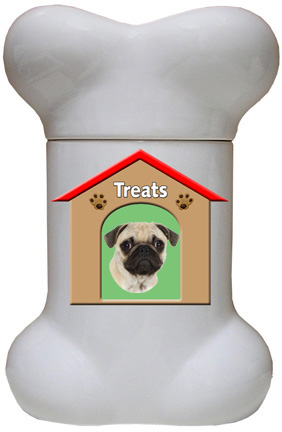 Store your dog’s favorite treats and biscuits in this unique, novelty bone-shaped ceramic cookie jar. This fun bone shaped treat jar makes a great gift for Pug lovers and complements any kitchen. The bone jar stands on its end, has an easy lift lid for treat time, is colorfully decorated, and will be the envy of all the dogs in town. It measures 9 inches tall, 6.5 inches wide and 5 inches deep.