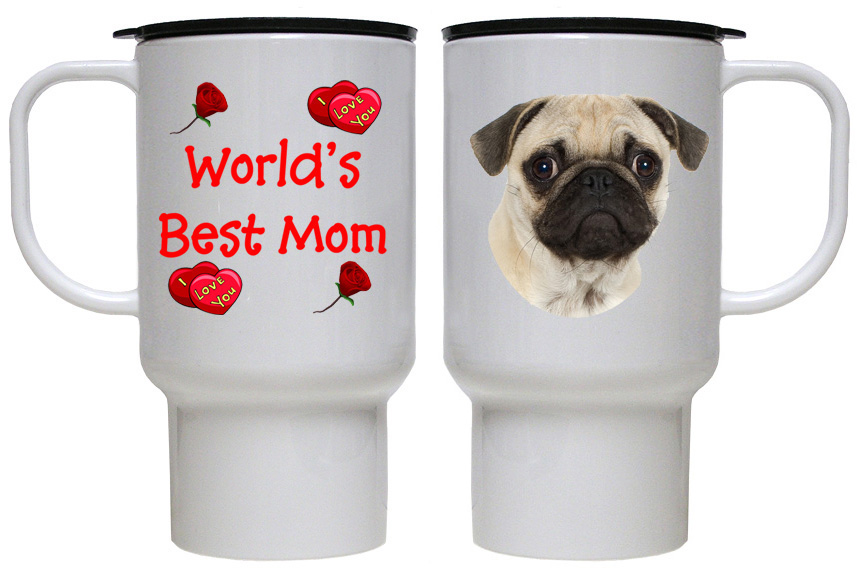 This 15 oz Travel Mug is made of a special bright white plastic polymer that makes it dishwasher and microwave safe. It features a marvelous Pug on one side and Worlds Best Dad on the other. The Pug Travel Mug is lightweight, unbreakable and comes with a lid.