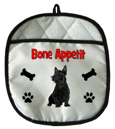 These soft, 100% terrycloth lined potholders have a heat-resistant black cotton palm, white poly top and a black cotton trim. Wonderfully decorated with your favorite Scottish Terrier these oven mitts are a must for every household. Overall the potholders measure about 9 by 10.5. Wash in cold water.