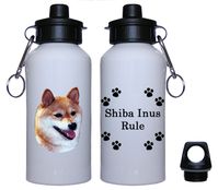 The 600ml White Aluminum Shiba Inu Water Bottles are the perfect size to bring to sporting events, for taking beverages to school or to give as a Shiba Inu themed gift. It features a colorful Shiba Inu on one side with Shiba Inus Rule and paws on the flipside. The water bottle comes with 2 cap fixings. One cap is a flip top stopper allowing you to drink from the bottle without removing the cap and the other screw top cap allows the bottle to be clipped to a belt and is supplied with a metal clasp. These White Aluminum Water Bottles are sturdy, lightweight and easy to clean.