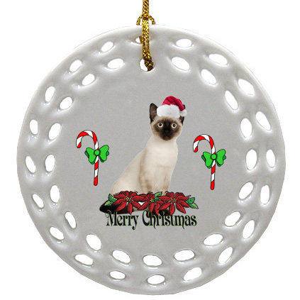 This delightful round porcelain Siamese Cat Christmas Ornament will provide a festive addition to your family celebrations. It features a Siamese Cat on the face and a wondrous Christmas tree on the back. Hang the ornament on your Christmas tree or decorate anywhere around the house. This collectible ornament also makes a great gift for any cat lover. Measures about 3 inches in diameter and 1/8 inch thick