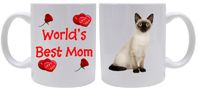 This beautiful 11 oz. ceramic Siamese Cat Worlds Best Mom coffee mug features a festive picture of a great looking Siamese Cat on the front with the phrase Worlds Best Mom on the back. It makes a great gift for Mom for Mothers Day, Birthday, Christmas or just to tell her you care. The Siamese Cat gift mug is dishwasher and microwave safe.