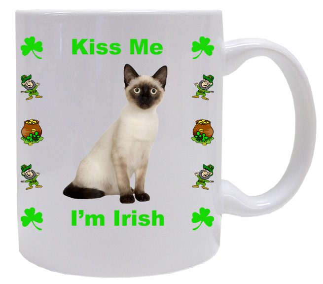 Celebrate all year long with our popular line of Irish themed Siamese Cat decorated products. This beautiful 11 oz. ceramic Siamese Cat Irish coffee mug features a festive picture of a great looking Siamese Cat on both sides surrounded with Shamrocks, Leprechauns and the phrase Kiss Me I’m Irish. The Siamese Cat Irish gift mug is dishwasher and microwave safe, and is great to give as a gift item for the Siamese Cat lover or to add to your own collection.