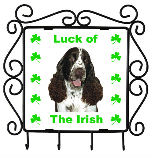 Celebrate all year long with our popular line of Irish themed Springer Spaniel decorated products. The Springer Spaniel Irish Metal Key Holder features a fabulous Springer Spaniel image and the saying – Luck of the Irish. The Irish Springer Spaniel Metal Key holder consists of a 6-inch Ceramic tile surrounded by an elegant black metal frame and four prongs to hang your keys. This item is great to hang in any room of the house or to give to as a special Springer Spaniel lover's gift. The metal frame measures about 8.75 wide by 9 inches high.