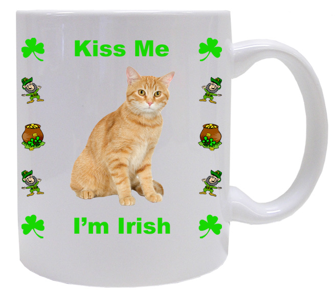 Celebrate all year long with our popular line of Irish themed Tabby Cat decorated products. This beautiful 11 oz. ceramic Tabby Cat Irish coffee mug features a festive picture of a great looking Tabby Cat on both sides surrounded with Shamrocks, Leprechauns and the phrase Kiss Me I’m Irish. The Tabby Cat Irish gift mug is dishwasher and microwave safe, and is great to give as a gift item for the Tabby Cat lover or to add to your own collection.