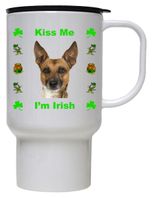 Celebrate all year long with our popular line of Irish themed Toy Fox Terrier decorated products. This 15 oz Travel Mug is made of a special bright white plastic polymer that makes it dishwasher and microwave safe. It features a festive picture of a great looking Toy Fox Terrier on both sides surrounded with Shamrocks, Leprechauns and the phrase Kiss Me I’m Irish.  The Toy Fox Terrier Irish Travel Mug is lightweight, unbreakable and comes with a lid.