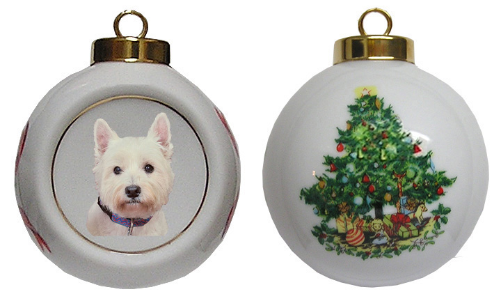 This porcelain ball ornament will make a perfect addition to any tree. The ornament features a rendition of a West Highland Terrier on the face with a Christmas tree and holly decorating this beautiful keepsake. Great to give as a gift for that merry West Highland Terrier loving person. Measures 2.5 inches in diameter.
